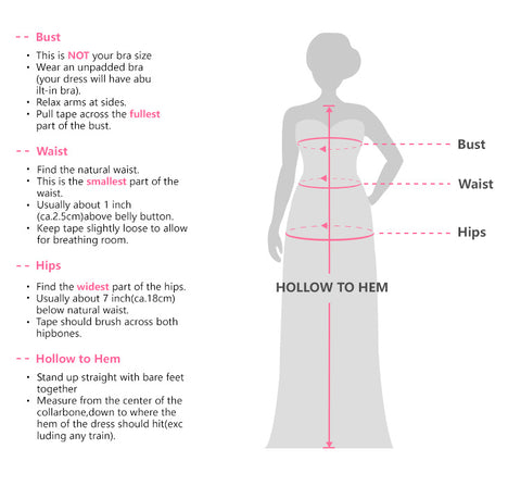 HOLLOW TO HEM: Stand up straight with bare feet together and measure from the center of the collarbone, down to where the hem of the dress should hit(excluding any train).